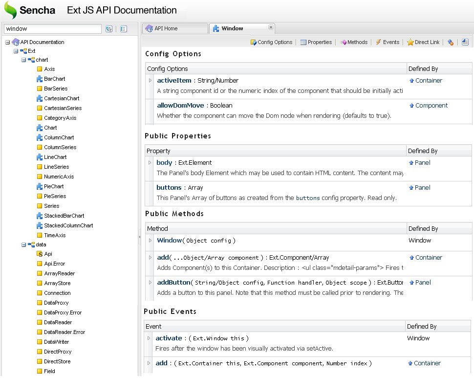 L'API ExtJs permet de connaître les différentes possibilités que nous offre chaque Classe.